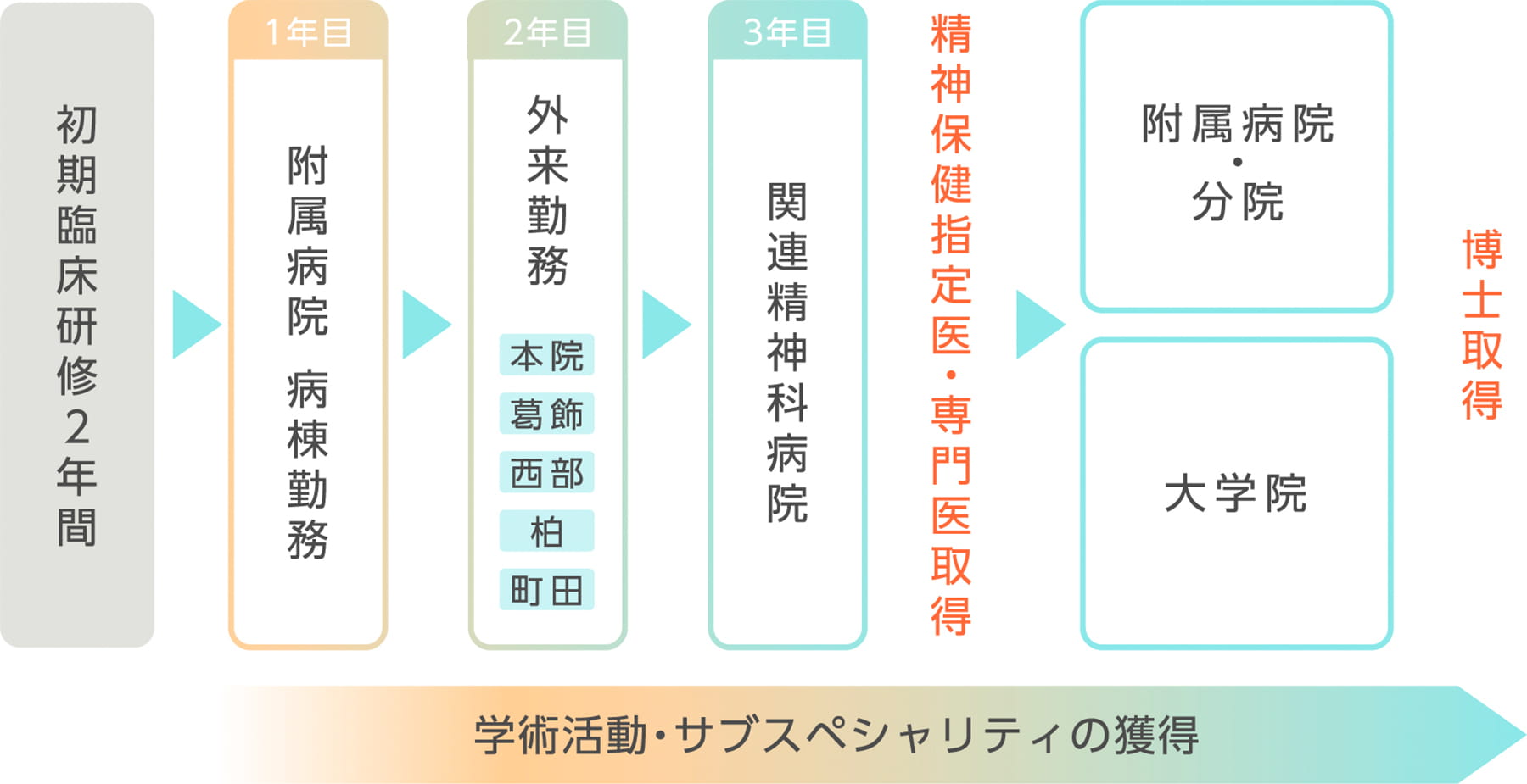 東京慈恵会医科大学精神医学講座では、精神科専門医・指定医の取得を目指す先生方が安心して、着実に成長していけるような卒後教育プログラムを組んでいます。
